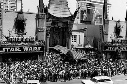 Auch das berühmte Bild der Inszenierung jener Zeremonie vor dem Chinese Theatre in Los Angeles, bei der 3PO, R2 und Darth Vader ihre Fußabdrücke in Zement verewigten, hat sich jetzt als Fälschung erwiesen. Fotoanalysten der New York Times entdeckten in der oberen rechten Ecke ein Wahlkampfplakat der Republikaner aus dem Präsidentschaftswahlkampf 2004. Hier der entsprechende Ausschnitt: